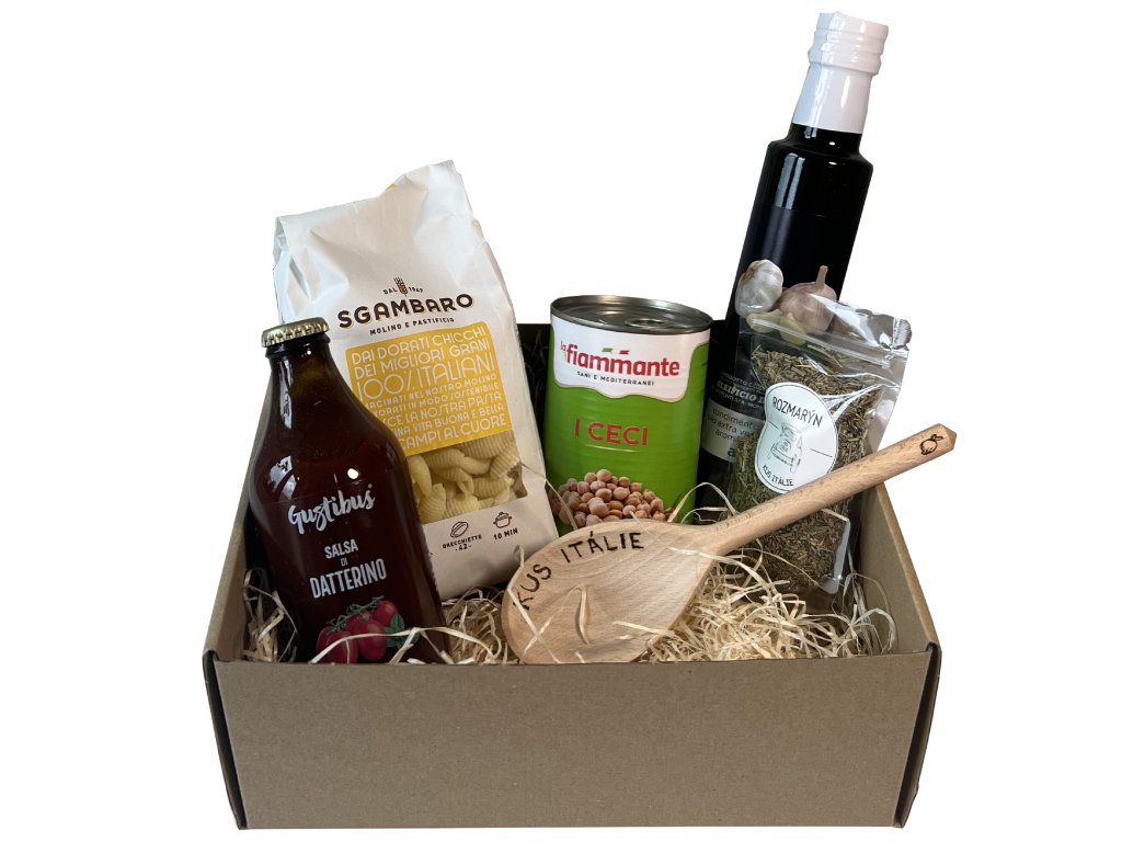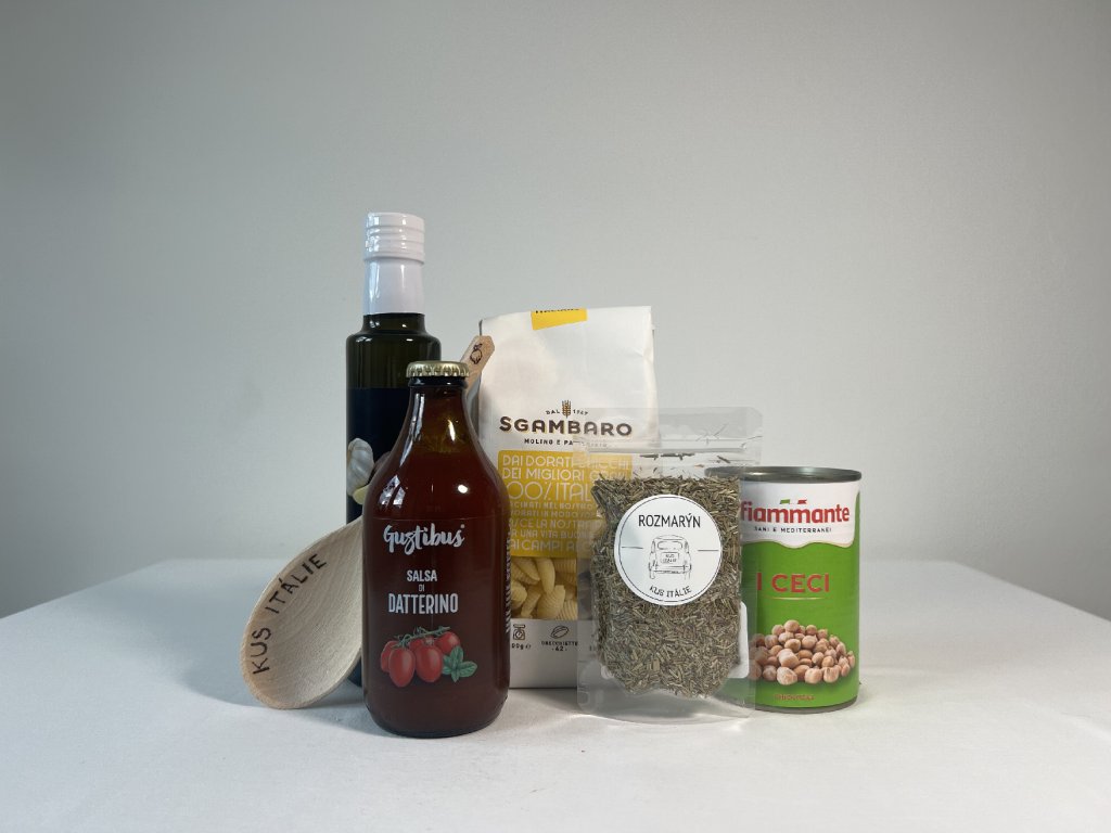 Balíček Pasta e Ceci obsahuje vše, co potřebujete k přípravě lahodného pokrmu, který kombinuje těstoviny, rajčata a cizrnu do skvěle ochucené pasty, která zahřeje a zasytí. Základem jsou těstoviny gnocchetti, které se díky svému tvaru skvěle obalí omáčkou. Sladká rajčata Datterino, kvalitní cizrna, špetka sušeného rozmarýnu a voňavý česnekový olivový olej vytvoří dohromady intenzivní chuť typickou pro domácí kuchyni Středomoří. Pro kompletní zážitek najdete v balíčku i personalizovanou vařečku.