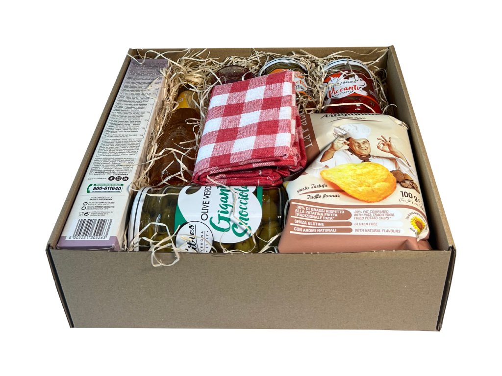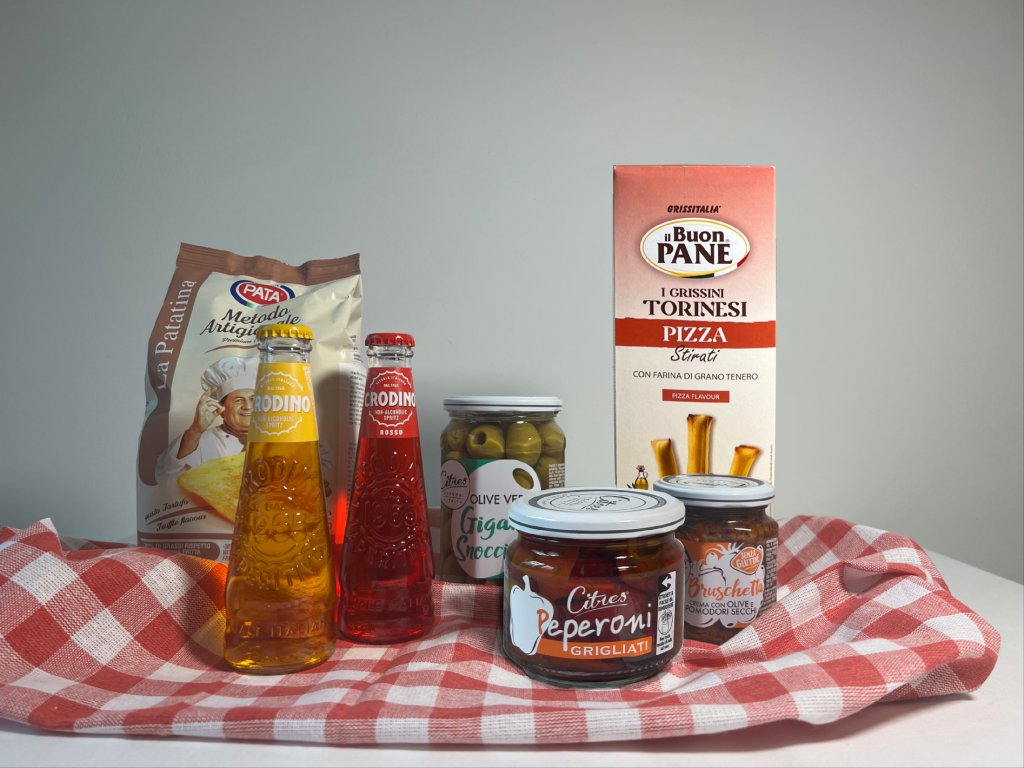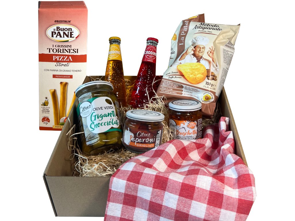 Balíček v sobě ukrývá všechny dobroty, díky kterým si užijete bezstarostný Piknik s přáteli. Uvnitř balíčku najdete osvěžující Crodino, křupavé grissini s příchutí pizzy, lanýžové brambůrky, pesto na bruschettu, výběrové olivy a nakládané grilované papriky.